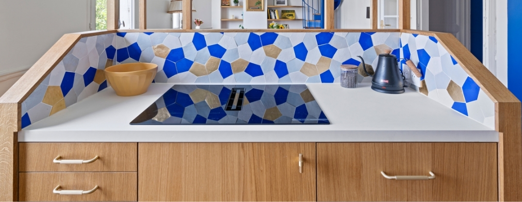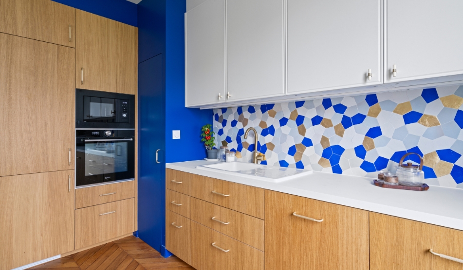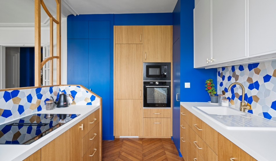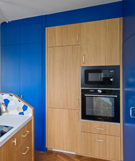 "Quand les matières et les couleurs dialoguent… Les façades Solène en chêne naturel révèlent toute leur chaleur face au bleu Klein signé ressource peintures et à la mosaïque en zellige personnalisée mosaic factory. Un projet imaginé par Alix, où le contraste devient synonyme d’élégance."