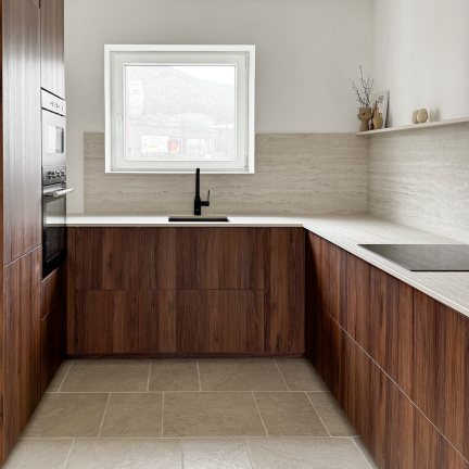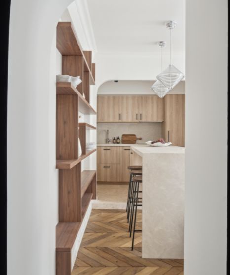 "La cuisine, imaginée à partir d’une base IKEA Metod, est habillée de nos façades SEVE. On y retrouve des teintes douces, un plan de travail clair et des poignées discrètes qui renforcent le côté épuré et intemporel. Les tabourets et étagères en noyer foncé apportent du contraste tout en restant dans une harmonie naturelle et délicate."